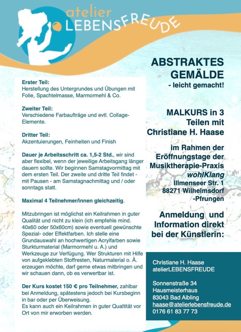 Anmeldung bei Christiane H. Haase, atelierLEBENSFREUDE, haase@atelierlebensfreude.de,
